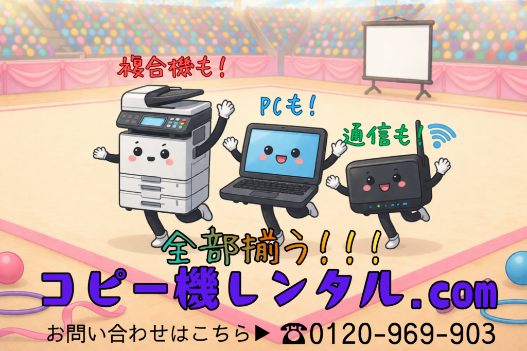 スポーツイベントや展示会、仮設会場などでは、複合機だけでなくパソコンや通信機器、映像機器などをまとめて手配できるかどうかが重要になります。